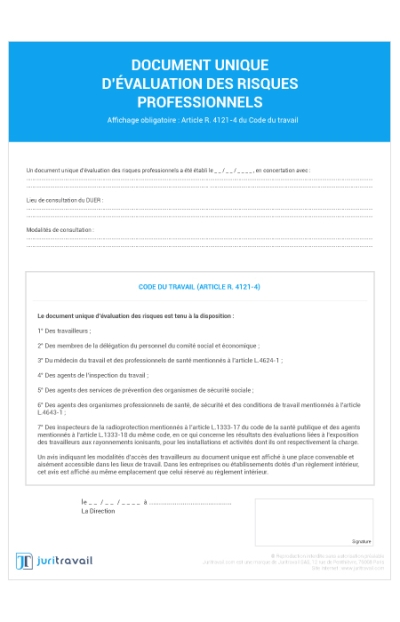 Vous avez mis à jour votre DUERP ? N'oubliez pas d'afficher les modalités de consultation et d'accès au Document Unique d'Évaluation des Risques Professionnels (DUERP) au sein de l'entreprise. En effet, tous les salariés doivent pouvoir consulter ce document. Pour éviter les problèmes, achetez le panneau, spécialement créé par Juritravail, sur les modalités de consultation et d'accès au DUERP.